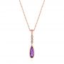 These rose gold drop earrings feature oblong pear cut amethyst gemstones and diamond accents.