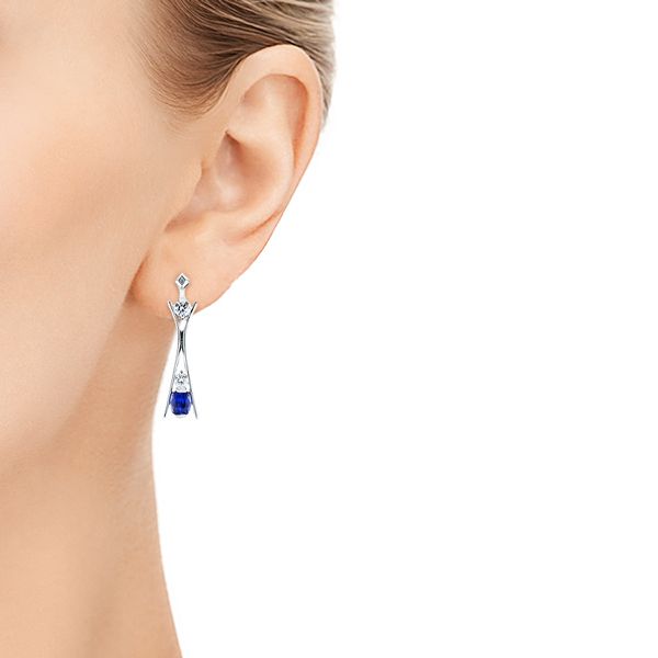 These gorgeous drop earrings feature bar set blue tanzanites at the bottom accented by round diamonds, all of which is framed beautifully by elegant strands of white gold. They were created for a client from Seattle, WA, and we made a matching pendant as well as a matching ring at the same time.