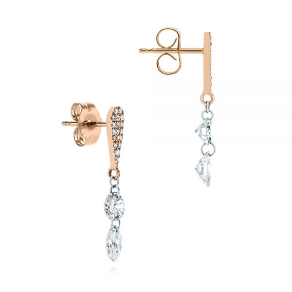 These gorgeous diamond earrings feature a pave set teardrop shape in rose gold and two drilled diamonds: one round and one marquise. They are a drop style earring and would make a sparkling statement in any fine jewelry collection. Earrings