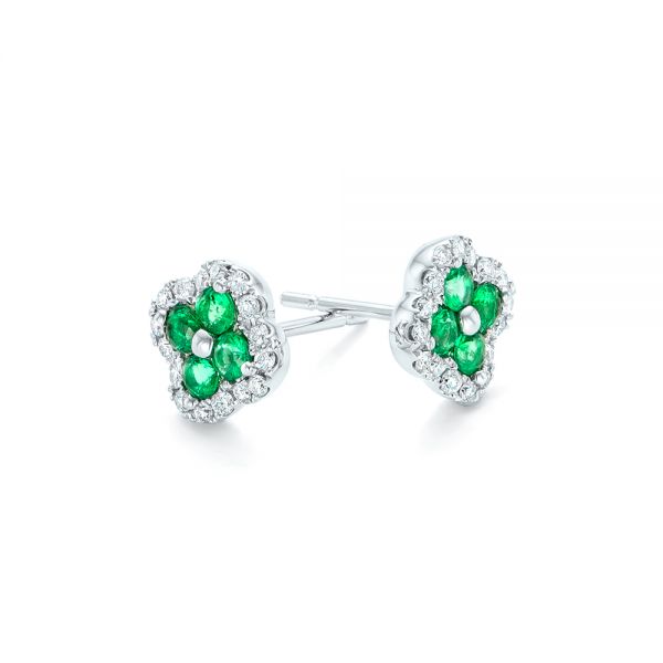 Each of these earrings features four round emeralds clustered together around a central white gold post, and these are all shared prong set in the same 14k white gold. This configuration creates the look of a four leaf clover, and the brilliant green color of the stones ties into that aspect as well. Taken together, the eight emeralds in this set total 0.35 carats.