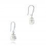 The main body of each earring is made up of a white freshwater pearl with a round indentation carved in the front of it. The sides of that indentation are lined with 14k white gold, and a single round diamond is bezel set at the lowest point of the depression. The two diamonds in this set together total, 0.08 carats, but their brilliant white sparkle is enhanced by the way they reflect off the metal on the sides of the depression.