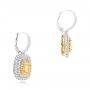 These beautiful drop earrings feature cushion shaped yellow diamonds prong set in the center, with halos of yellow and white diamonds surrounding them. They utilize both white and yellow gold to create a two-tone look that still keeps the gemstones front and center, and they can be customized in any number of ways to make them match your personal style. Design Your Own Earrings