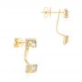 Both main sections of each earring center on a baguette cut light green amethyst that’s bezel set in 14k yellow gold. These are surrounded on three sides be a halo of split prong set diamonds, which bring a glamorous sparkle and delicate contrast to the piece. The fourth side is the bottom of the top piece and the top of the bottom piece, which leaves them open as they face each other across the earlobe when the earrings are worn.
