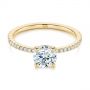 The prongs themselves originate on the top surface of the band, and this allows them to hold the diamond up clearly above the rest of the ring, ensuring its place as the centerpiece of the design. For added structural support and satisfying visual balance, a thin gallery rail runs around the stone between the prongs about halfway up the side of the center setting. Conflict Free Diamonds
