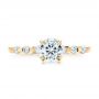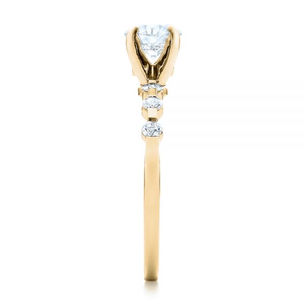 The main diamond in this ring is 0.71 carats and round brilliant cut. The four prongs holding it rise up from the shank and cradle it securely while still letting as much of the stone as possible shine through from all sides. This type of setting gives the ring a bit of contemporary flair, and it really moves the center stone out in front as the highlight of the piece. Diamond Engagement Rings