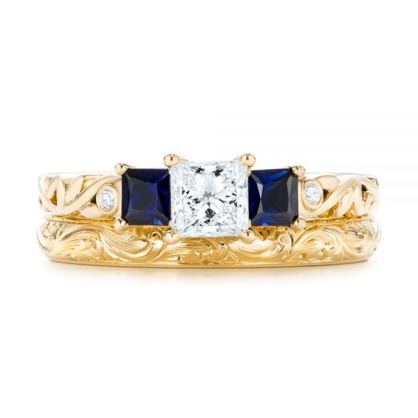 14k Yellow Gold Custom Three Stone Blue Sapphire And Diamond Engagement Ring