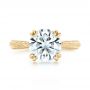 The diamond at the center of this ring is two carats and round brilliant cut. The four double prongs holding it in place are platinum, and they curl up around the edges of the diamond, adding some lovely contours to the top of the ring. The entire center setting sits high up above the tapered shank, and this position places the diamond front and center no matter which angle the ring is viewed from. Solitaire Engagement Rings