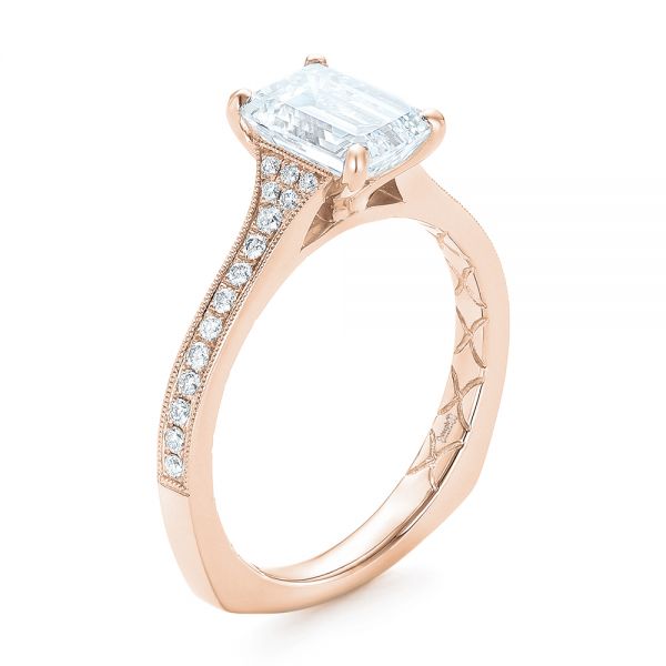 This dazzling engagement ring features an emerald cut diamond prong set atop a platinum Euroshank with bright cut set diamond and milgrain accents on the band. It was created for a client from Mercer Island, WA, who visited our Bellevue, WA showroom personally several times throughout the custom design process. He personally examined the diamond we selected for the center, and after seeing the 3D models of the piece we proposed to build, he quickly gave his approval to move things into production. Design Your Own Engagement Ring