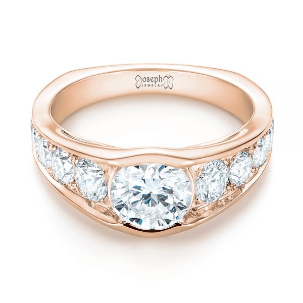 The open sides of the setting also facilitate a smooth transition into the accent diamonds that line the shank shoulders. These are round and bright cut set, and they taper in size to match the narrowing of the band as they move away from the top. There are five accent diamonds on each side of the center, and they end just below the mid-point on the band. Unique Engagement Rings Seattle