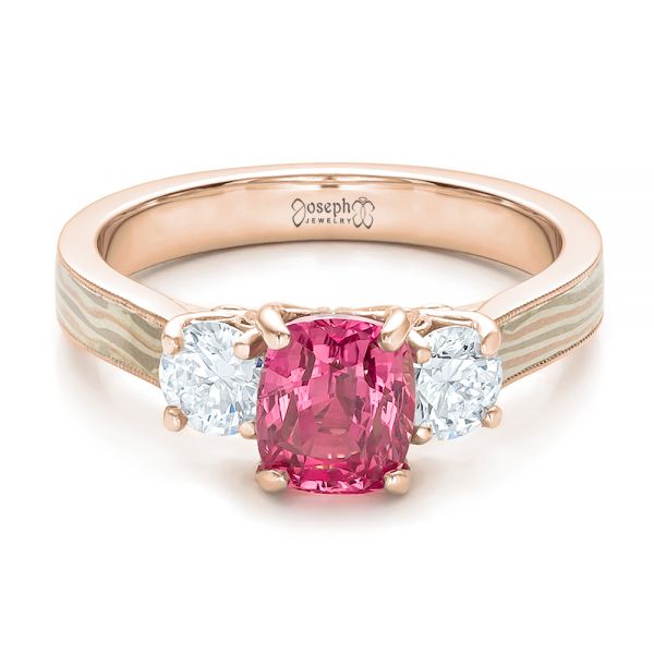 This exquisite engagement ring features a cushion shaped Padparadscha sapphire in the center of a three-stone setting, with round brilliant cut diamonds on either side, and a mokume gane inlay on the band. It was created for a couple from Seattle, WA, who worked with our team in person in our Bellevue, WA showroom to make sure the pieces we produced was exactly what they were after. It's a great match with men’s band #100593.