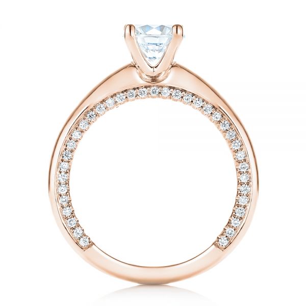 This stunning engagement ring features a round brilliant cut diamond prong set atop a tapered white gold shank, with bright cut set diamond accents lining both ring fronts. Its an elegant and unique design with great potential for customization, and our team is ready to work with you to help make it your own. Design Your Own Engagement Ring