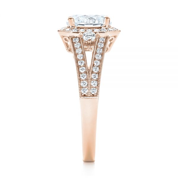 A larger round diamond is prong set across the widest point of the split on each side, echoing the center stone and brining a nice balance to the design. All of the bright cut set diamond accents, both in the halo and on the shank, are lined with milgrain beading, and scroll filigree brings an ornate and open feel to the ring fronts to help complete the vintage design.