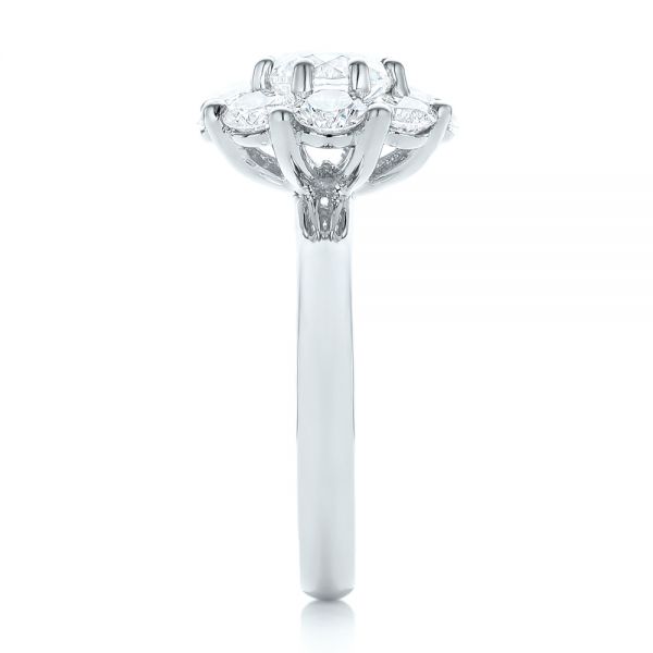 A ring of eight smaller diamonds surrounds the center stone, and these are cluster set, helping to give the entire center setting a hint of a floral theme. The diamonds in the halo total 1.13 carats all together, and they mirror the shape of the center stone perfectly, helping to give the piece a nice overall balance.