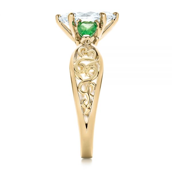 This stunning engagement ring features a marquise shaped diamond prong set in platinum, with a pear-shaped green peridot on either side, and custom yellow gold filigree on the shank. It was created in consultation with a client from Kirkland, WA, who initially reached out to us online through our Ring Builder tool.