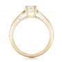 The diamond at the center of this piece is a square radiant cut stone in a four prong setting. The rounded ends of the prongs holding it in place work well with the diamond’s slightly domed shape, and the overall openness of the setting lets the stone’s brilliance shine through from every angle. Diamond Engagement Rings