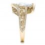 Just before reaching the large diamond at the top, the strand on the right loops back to meet the one on the left, closing off the opening and creating a smooth perimeter for the center setting. Custom filigree in a complementary pattern to that found on the top of the band also occupies the space below the shank shoulders, and its wonderful intricacy works well with the overall flow of the band design. Vintage Engagement Rings
