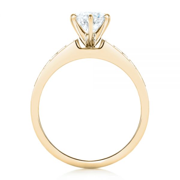 This stunning engagement ring features a round brilliant cut diamond in a six prong setting, with channel set diamond accents in a white gold band. It was designed for a client from Snohomish, WA as part of a wedding set that also included wedding band #102400. The client first came into our Bellevue, WA showroom personally to outline exactly what she was looking for, and she then communicated with our design team online to finalize the details of her set.