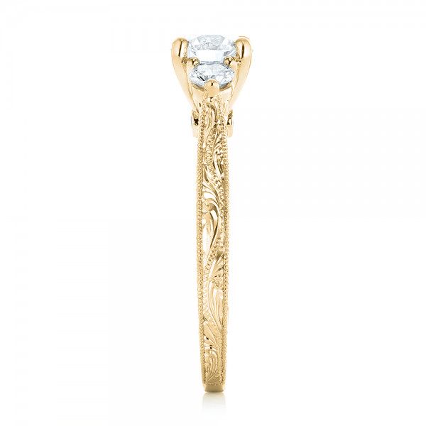 This stunning engagement ring features a round brilliant cut diamond at the center of a three-stone setting, with smaller round diamonds on the sides and custom filigree accents on the hand-engraved shank. It was created for a client from Seattle, WA, and it represents a classically elegant style that we can help you customize until it’s the perfect reflection of your ideal ring. Design Your Own Engagement Ring