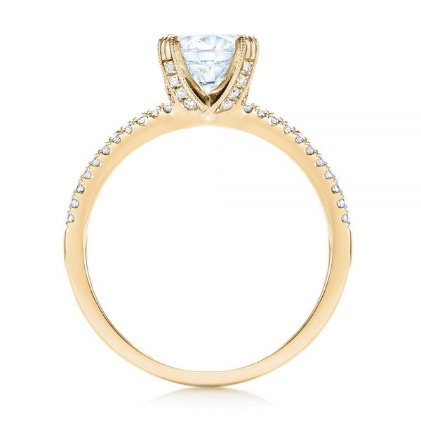 At the top of this ring, a one carat round brilliant cut diamond is cradled securely by four talon prongs made of 18k white gold. The prongs are somewhat broader than average on the side, but they narrow to points as they begin to curl around the diamond. Each edge of the prong is also lined with milgrain beading for some added vintage flair. Diamond Engagement Rings