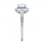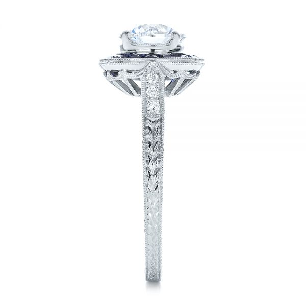 This engagement ring comes from Joseph Jewelry’s Art Deco series. It features a round brilliant cut diamond surrounded by a halo of specially-cut blue sapphires to achieve the striking, geometric aesthetic that the art deco style is known for. The white gold shank is accented with six small diamonds and trimmed with milgrain and hand engraving. Altogether, the ring has a timeless, elegant appearance.