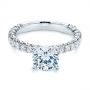At the top of this ring, an 18k white gold four-prong setting perfectly frames a round brilliant cut diamond. The setting rises up directly from the top of the ring, and so the stone is held in a clear place of prominence high above the small round accent stones that line the shank shoulders below. These accents, in fact, run all the way down to about the three-quarter mark on each side, and they are composed of 20 small, round diamonds that combine to total 0.65 carats. Diamond Engagement Rings