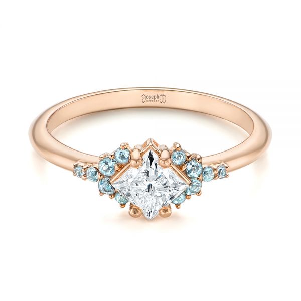 Six round aquamarines of varying sizes sit on either side of the center, with the two largest on either side of the points of the princess cut. Slightly smaller stones take up the positions on the outsides of these, and the smallest aquamarines in the group extend in a line away from the center setting on the top of the band. Rose Gold Engagement Rings