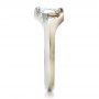 Although the band is made entirely from 14k white gold, one side of it is plated while the other side is not. This creates a subtle two-tone look, with the unplated side exhibiting the champagne color of the natural metal. The plated side is brilliant white, and this difference is highlighted further by the use of contrasting finishes on the two sections. The unplated side is brushed, while the plated side is polished, and these two divergent textures bring out different elements of each type of metal. One of a Kind Engagement Rings