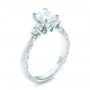 The 14k white gold shank is thickest at the bottom, and it tapers gradually from about the half-way mark until it comes almost to a point when it reaches the accent diamonds. The fronts of the shank down to the three-quarter point feature beautiful hand-engraving lined with milgrain beading for an elegant and classy touch.