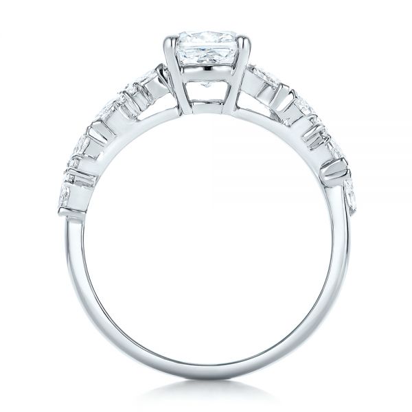 Running down the shoulders of the shank are accent diamonds laid out in an alternating pattern of marquise and round cut stones. This evokes an organic leaf pattern, while also matching up perfectly with the arrangement of stones in the companion wedding band.