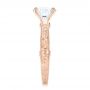 This exquisite engagement ring features a round diamond prong set in rose gold, with custom hand engraving on the band, hand-made filigree, and several round morganite accent stones. The design was developed in consultation with a client from Mount Holly, NJ, who came to us with his ideas about the kind of ring he wanted for his fiancee-to-be.