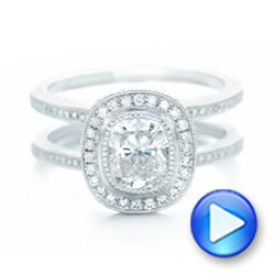 This vintage-inspired engagement ring features a cushion cut diamond bezel set in the middle of a halo of bright cut set diamonds, with additional diamond and milgrain accents on the interlocking platinum band. It was created for a couple from Seattle, WA, and we also made them a wedding band to go with it. Design Your Own Engagement Ring