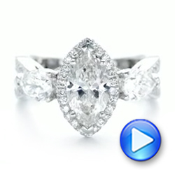 This dazzling engagement ring features a marquise diamond prong set in the center of a pave set diamond halo, with additional diamond accents on the split platinum shank. It was created for a client from Wichita, KS, who reached out to us over the phone initially after finding a design that she liked online.
