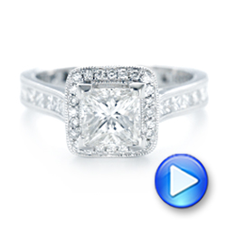 This stunning engagement ring features a princess cut diamond in the center of a diamond halo, with additional princess cut diamond accents lined with milgrain on the white gold shank. It was created for a client from Lopez Island, WA, who found a piece in our Bellevue, WA showroom that she wanted to work with us to customize. She also had quite a few diamonds that she wanted to incorporate into the customization, adding an extra special touch to such an already significant ring. Design Your Own Engagement Ring