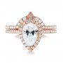 The centerpiece of this ring is a 1.10 carat pear-shaped diamond, and it’s held in place by three prongs made of 14k rose gold. Surrounding this elegant stone is a contoured halo of split prong set diamonds, and this detail, combined with the shape of the center, helps establish the vintage style the client was after. Rose Gold Engagement Rings