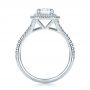 French cut set diamond accents begin at the mid-point on the band, running all the way up to the center setting as well and creating a link between the halo and the band below. All of the accent diamonds in this ring, both in the the halo and on the shank, are round, offering a subtle contrast with the shape of the larger diamond at the top.