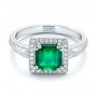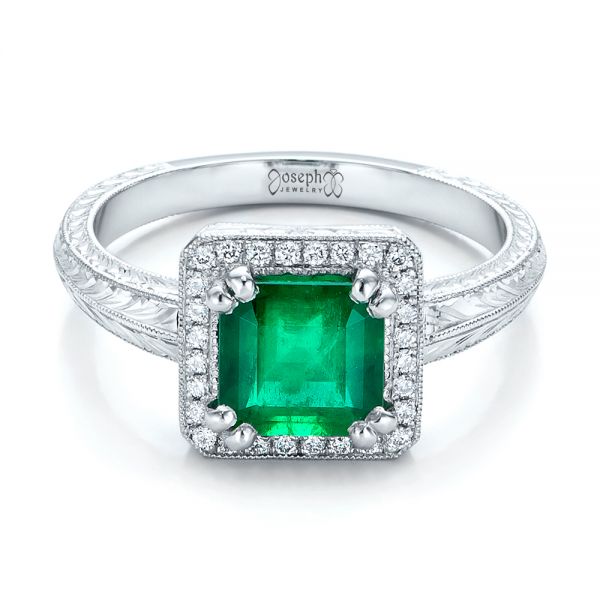 This dazzling engagement ring features a radiant cut emerald, surrounded by a diamond halo, and accented with milgrain and hand engraving on the band. It was created for a client from Redmond, WA, who worked with our team in person in our Bellevue, WA showroom to finalize the details of the piece.