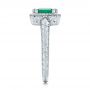 In the case of this particular ring, the stone in the center is a 1.26 carat radiant cut emerald. This type of cut gives the gem a square shape with slightly softened corners that’s complemented nicely by the four sets of double prongs holding it in place. The emerald itself also has a rich, green color that contrasts beautifully with the brilliant white of the platinum that makes up the rest of the ring.