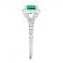 A slightly squared halo of French cut set diamonds surrounds the center emerald. The shape of the halo helps to highlight the elegant curves of the larger stone, and it brings a delicate vintage flair to the ring as well.