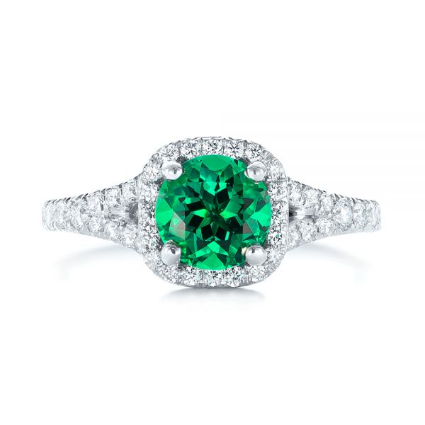 This dazzling engagement ring features a round emerald prong set in the center of a French cut set diamond halo, with additional diamond accents on the split platinum shank below. It was created for a client from Noblesville, IN, who initially visited our Bellevue, WA showroom in person to get the custom design process underway.