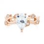 The largest gemstone in this ring is a pear-shaped Forever One moissanite that measures 9m by 6mm, and its prong-set in 14k rose gold. It extends out over the band of the ring farther on the pointed end than on the other, and this precise positioning was just what the client wanted in order to highlight the elegant shape of the stone and really allow it to dominate the design. Rose Gold Engagement Rings