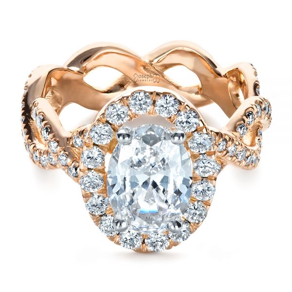 This exquisite engagement ring features an oval diamond prong set in the center of a split prong set diamond halo, with additional diamond accents on the criss-cross rose gold shank. It incorporates some lovely classical features in a unique way to produce a contemporary-styled design with vintage overtones, and it can be modified in any number of ways to make it better match your vision of the ideal ring. Design Your Own Engagement Ring
