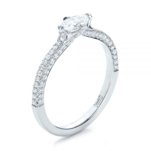 This elegant engagement ring features a marquise diamond prong set East-West in line with the white gold band, accented with pave set diamonds on the shank shoulders. It was created for a client from Renton, WA, who worked with our team in our Bellevue, WA showroom to finalize all details of the piece.