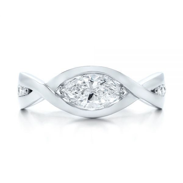 This elegant engagement ring features a marquise shaped diamond chevron set in a white gold criss-cross shank, with additional diamond accents on the sides. The design was developed for a client from Union, NJ, who initially used our Ring Builder program to share his feature and style preferences with our team.