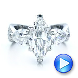 This stunning engagement ring features a marquise cut diamond prong set in the center of a three stone setting, with pear shaped diamonds on the sides. The split platinum shank is accented with bright cut set diamonds and milgrain beading. It was created for a couple from Seattle, WA, who worked with our designers both online and in person in our Bellevue, WA showroom to finalize the details of the piece. We created wedding band for them as well to match and complement this exquisite piece.