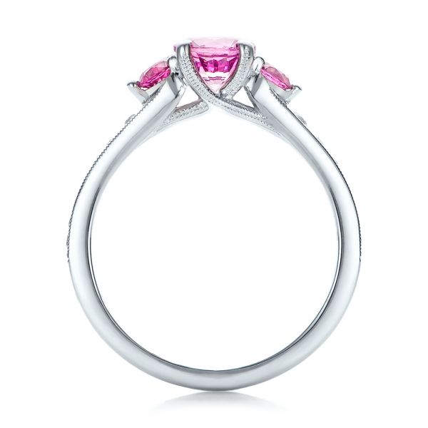 As a finishing touch on this piece, round diamonds tapering in size are channel set running down the shank shoulders to the mid-way point on the band. These offer a nice link between the round pink sapphires at the top and the white gold band, and they bring some added sparkle of their own. The diamonds are also lined with milgrain beading to give the piece a sense of completion and to reinforce the classical aesthetic.