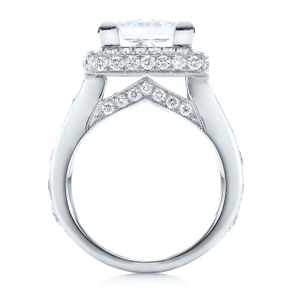 The client who designed this piece brought us her old jewelry to have the diamonds extracted and put into a new ring. We helped her to construct a new setting around these stones that would preserve all the same charm of the original jewelry. Her large, princess cut diamond became the center stone, mounted in a platinum four prong setting and surrounded by a halo of bright cut diamonds. The sides of the shank itself are each lined with five large diamonds, making for a bold, dazzling final product. Diamond Engagement Rings
