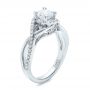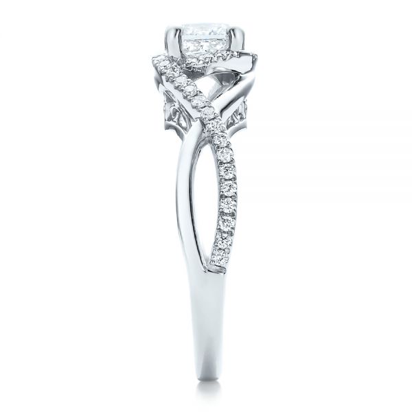 Split prong set diamonds run up one strand of the split criss-cross shank on each side, starting at the half-way point and eventually wrapping around the center setting at the top. This creates a halo around the main diamond, and the additional sparkle these accent stones bring to the piece only intensifies the display.
