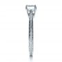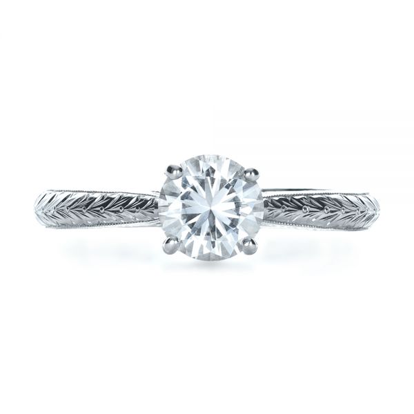 The top and fronts of the band down to the three-quarter point are covered with a wheat pattern of custom hand engraving, and lines of milgrain beading separate the different sections, framing them perfectly. Milgrain lines the bezel settings of the accent diamonds as well, bringing a decidedly vintage flair to the design and helping to unite the various sections of the piece. Diamond Engagement Rings