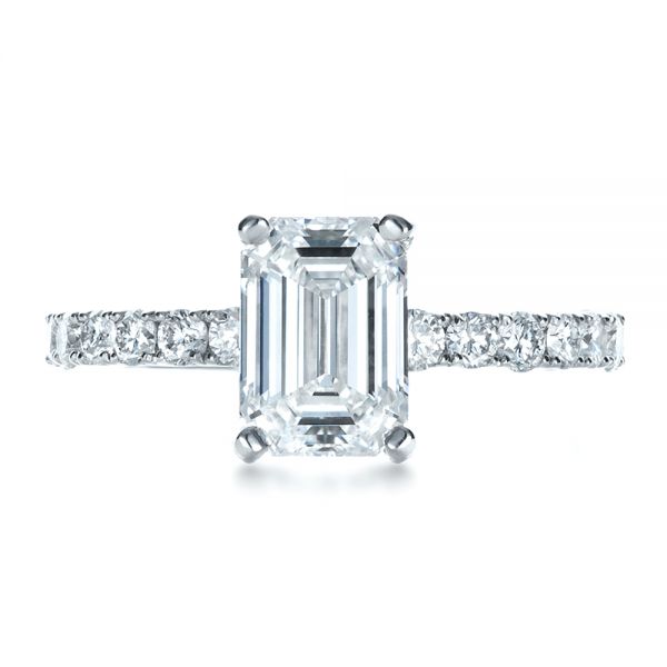 This stunning engagement ring features an emerald cut diamond, perched atop a narrow platinum band, and accented with split prong set round diamonds. It’s a wonderful example of a classical style that incorporates contemporary themes, and it’s one you can modify in any number of ways to make more your own. Design Your Own Engagement Ring