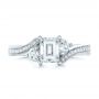 The main setting in this ring includes three stones, with the center a 0.71 carat emerald cut diamond. It’s held securely with four 14k white gold prongs that rise up from the inner band below, and its squared shape is perfectly complemented by the rounded edges of the two side stones that complete the setting.Diamond Engagement Rings